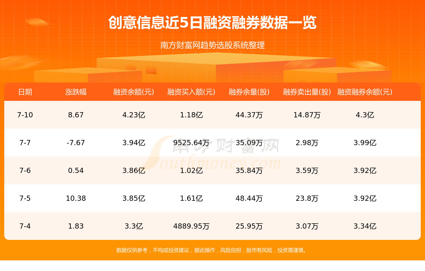7月11日创意信息融券信息显示,融资方面,当日融资买入1.15亿元,融资偿还1.17亿元,融资净买额-198.53万元。融券方面,融券卖出10.16万股,融券偿还7.92万股,融券余量46.61万股,融券余额684.67万元。融资融券余额4.28亿元。近5日融资融券数据一览见下表: