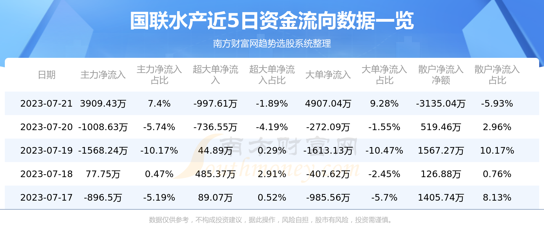7月21日消息,国联水产7月21日主力资金净流入3909.43万元,超大单资金净流出997.61万元,大单资金净流入4907.04万元,散户资金净流出3135.04万元。