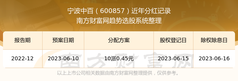 宁波中百最新一次公布的分红方案为10派0.45元。本次权益分派股权登记日为2023年6月15日,除权除息日为2023年6月16日,派息日为2023年6月16日。