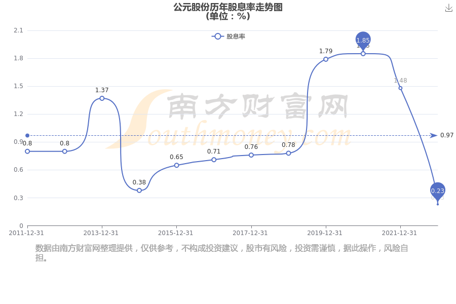 公元股份最新一次公布的分红方案为10派0.12元。本次权益分派股权登记日为2023年5月30日,除权除息日为2023年5月31日,派息日为2023年5月31日。