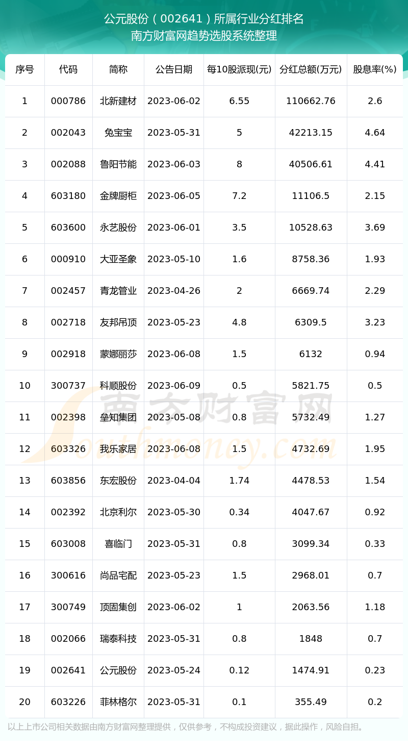 按照趋势选股系统统计,公元股份所属行业为PVC管材行业,PVC管材行业分红排名情况如下表: