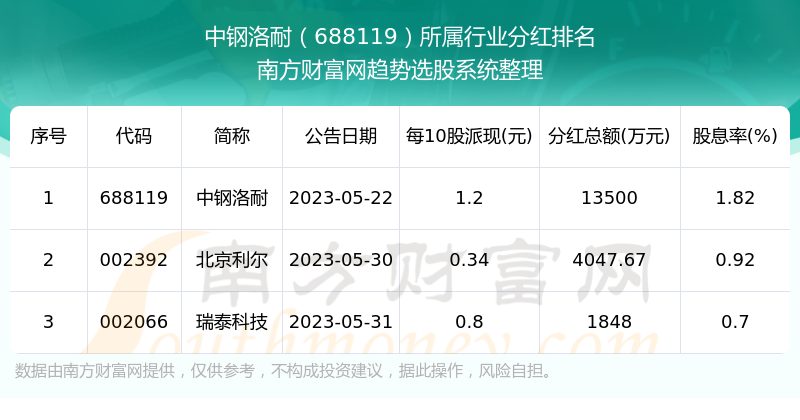 按照趋势选股系统统计,中钢洛耐所属行业为耐火材料行业,耐火材料行业分红排名情况如下表: