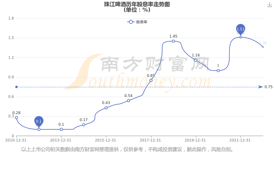 近年珠江啤酒年度股息率走势如下图: