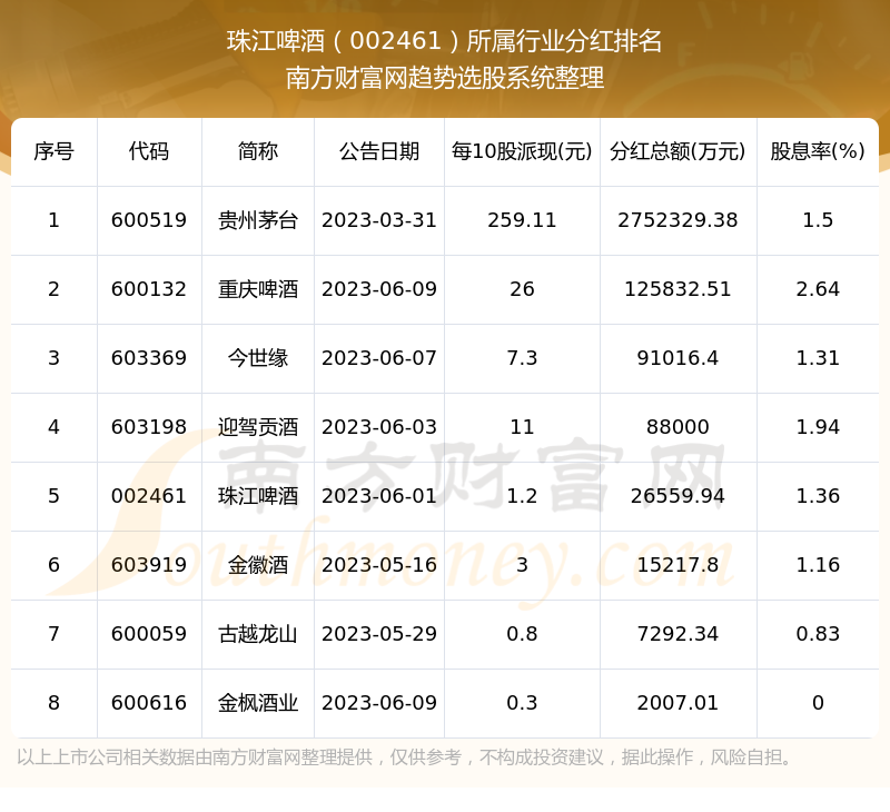 二、珠江啤酒002461行业分红排名