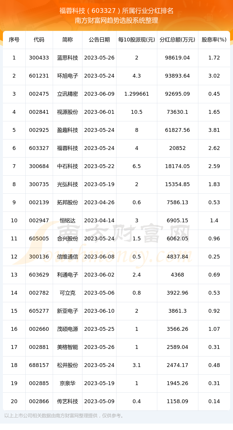 按照趋势选股系统统计,福蓉科技所属行业为消费电子行业,消费电子行业分红排名情况如下表: