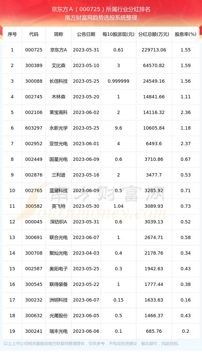 按照趋势选股系统统计,京东方A所属行业为显示器件行业,显示器件行业分红排名情况如下表: