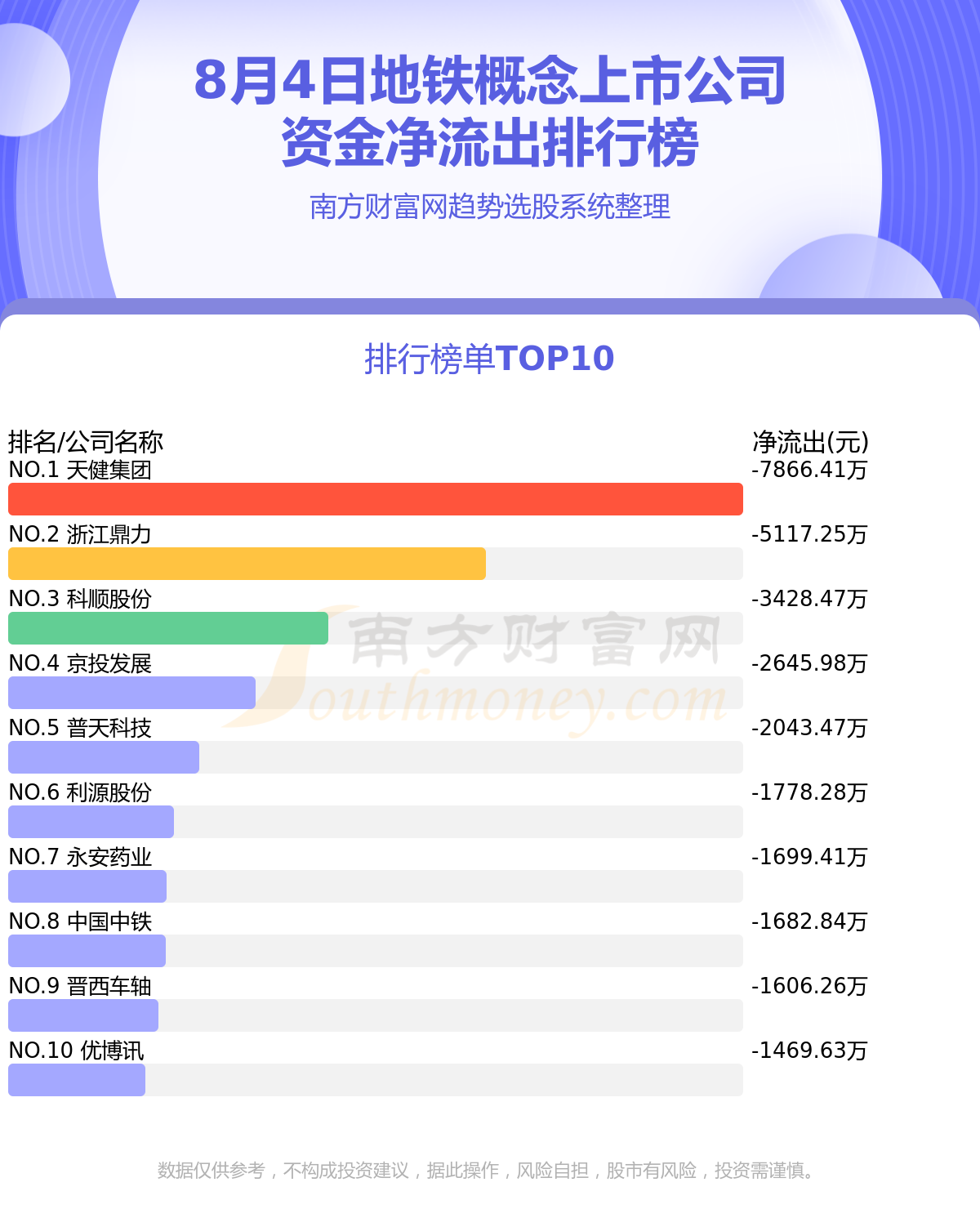 地铁概念上市公司8月4日资金净流出情况来看,天健集团位列第一位,主力净流出达到-7866.41万元;浙江鼎力排名第二,主力净流出为-5117.25万元;科顺股份排名第三,主力净流出-3428.47万元。主力净流出排名前10的还有:京投发展、普天科技、利源股份、永安药业、中国中铁、晋西车轴、优博讯。