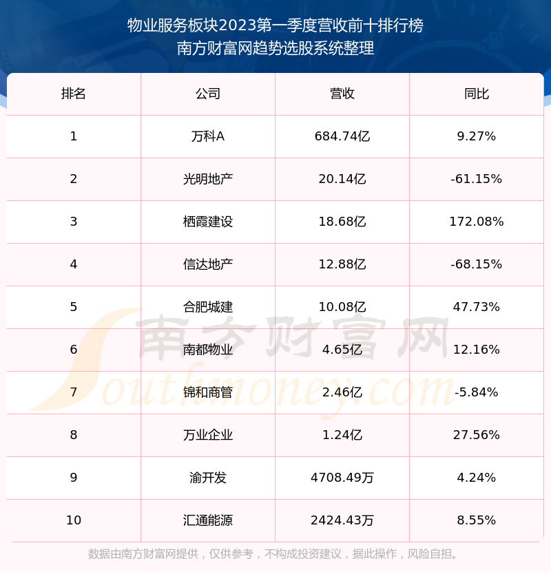 按照趋势选股系统统计,该股所属板块为物业服务板块,该板块共有11只股票,锦和商管2023第一季度营收在该板块中排名为第7名,该板块2023第一季度营收排名前十的股票如下表:
