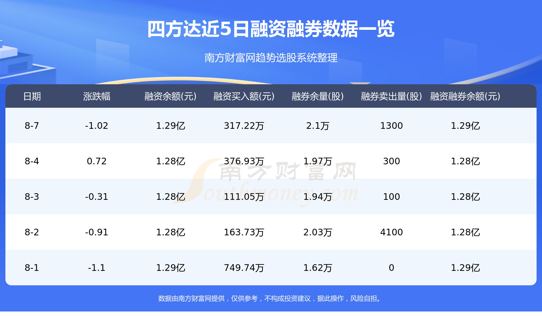 8月7日四方达融券信息显示,融资方面,当日融资买入317.22万元,融资偿还204.24万元,融资净买额112.98万元。近5日融资融券数据一览见下表: