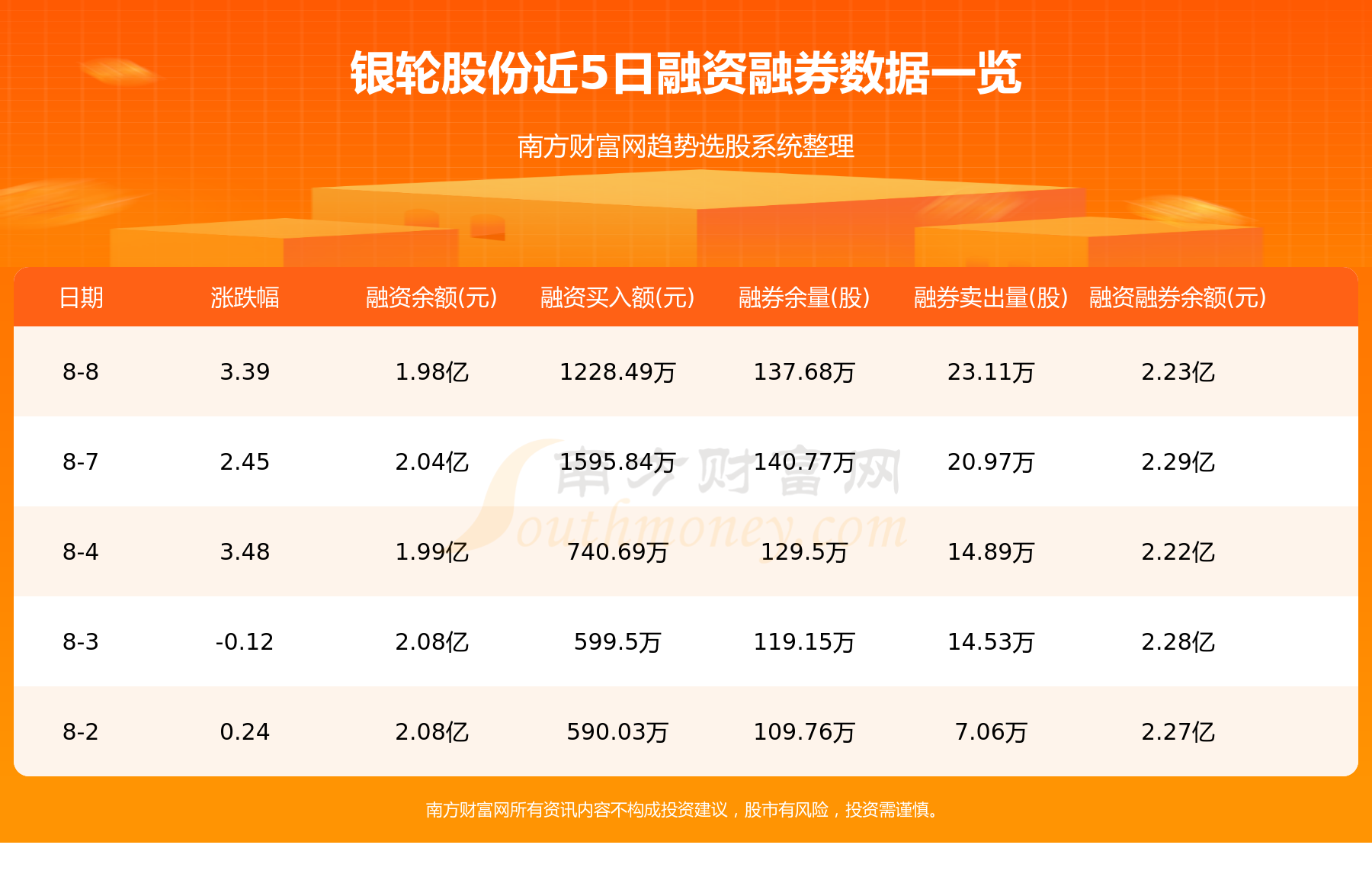 8月8日银轮股份融券信息显示,融资方面,当日融资买入1228.49万元,融资偿还1856.83万元,融资净买额-628.34万元。融券方面,融券卖出23.11万股,融券偿还26.19万股,融券余量137.68万股,融券余额2559.53万元。融资融券余额2.23亿元。近5日融资融券数据一览见下表: