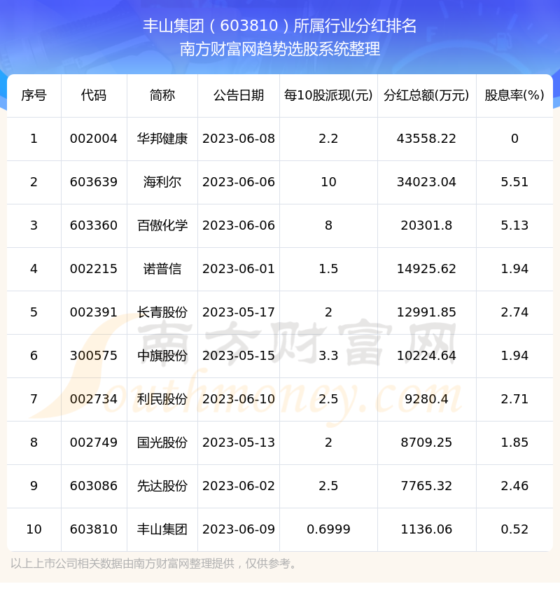 丰山集团最新一次公布的分红方案为10派0.6999元。本次权益分派股权登记日为2023年6月14日,除权除息日为2023年6月15日,派息日为2023年6月15日。