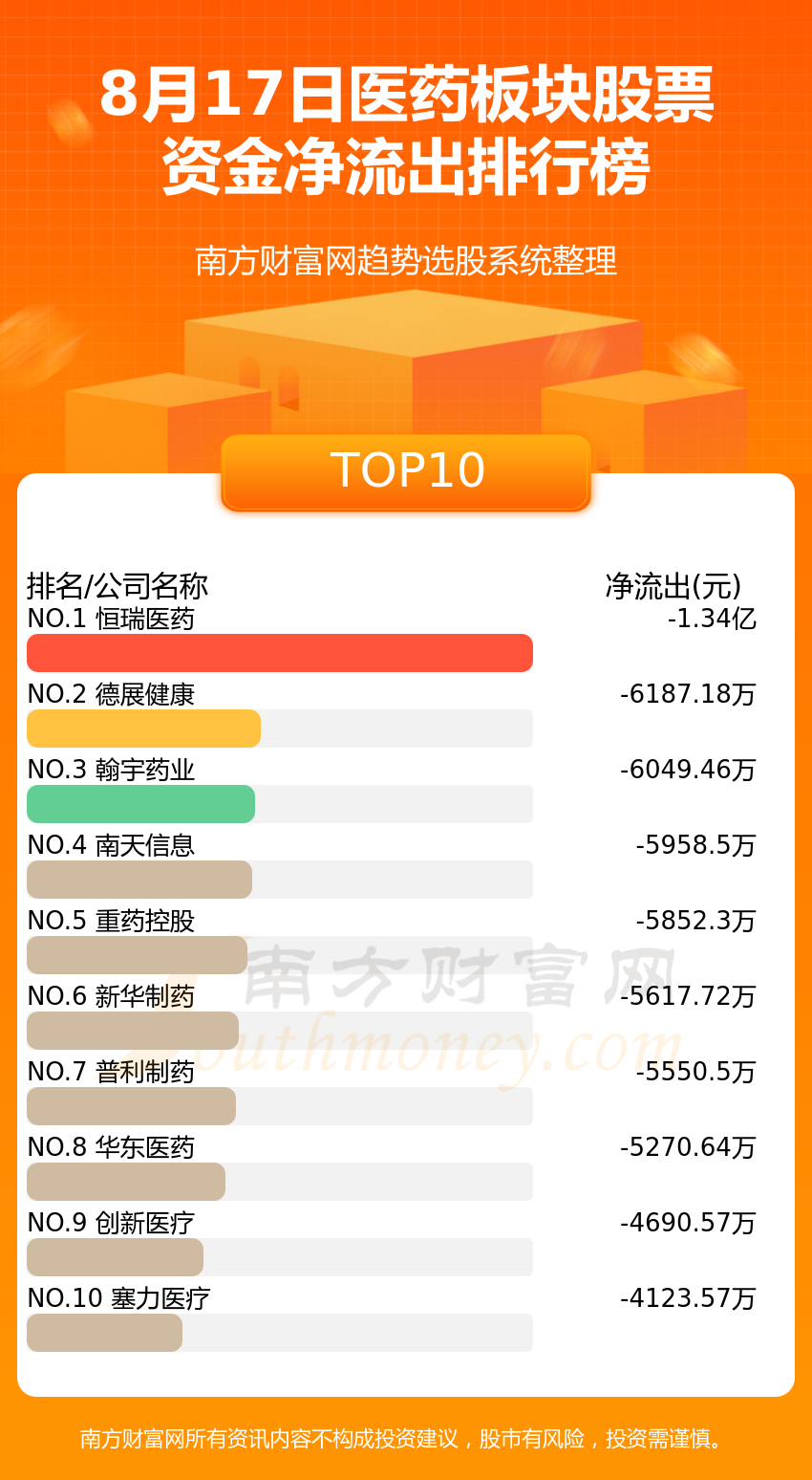 医药板块股票8月17日资金净流出情况来看,恒瑞医药位列第一位,主力净流出达到-1.34亿元;德展健康排名第二,主力净流出为-6187.18万元;翰宇药业排名第三,主力净流出-6049.46万元。主力净流出排名前10的还有:南天信息、重药控股、新华制药、普利制药、华东医药、创新医疗、塞力医疗。