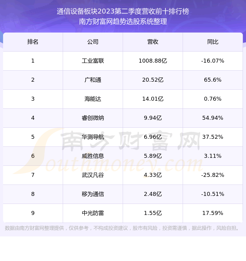 按照趋势选股系统统计,该股所属板块为通信设备板块,该板块共有9只股票,三旺通信2023第二季度营收在该板块中排名为第9名,该板块2023第二季度营收排名前十的股票如下表: