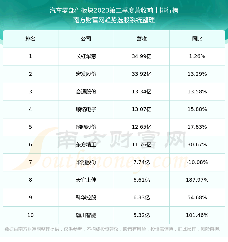按照趋势选股系统统计,该股所属板块为汽车零部件板块,该板块共有20只股票,长源东谷2023第二季度营收在该板块中排名为第20名,该板块2023第二季度营收排名前十的股票如下表: