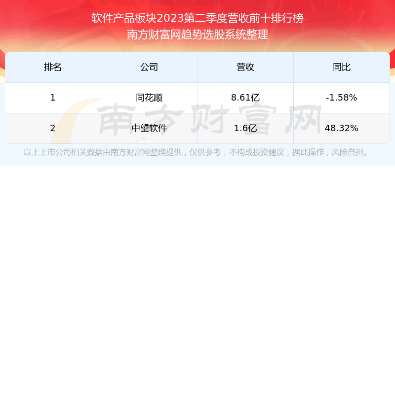 按照趋势选股系统统计,该股所属板块为软件产品板块,该板块共有2只股票,星环科技2023第二季度营收在该板块中排名为第2名,该板块2023第二季度营收排名前十的股票如下表: