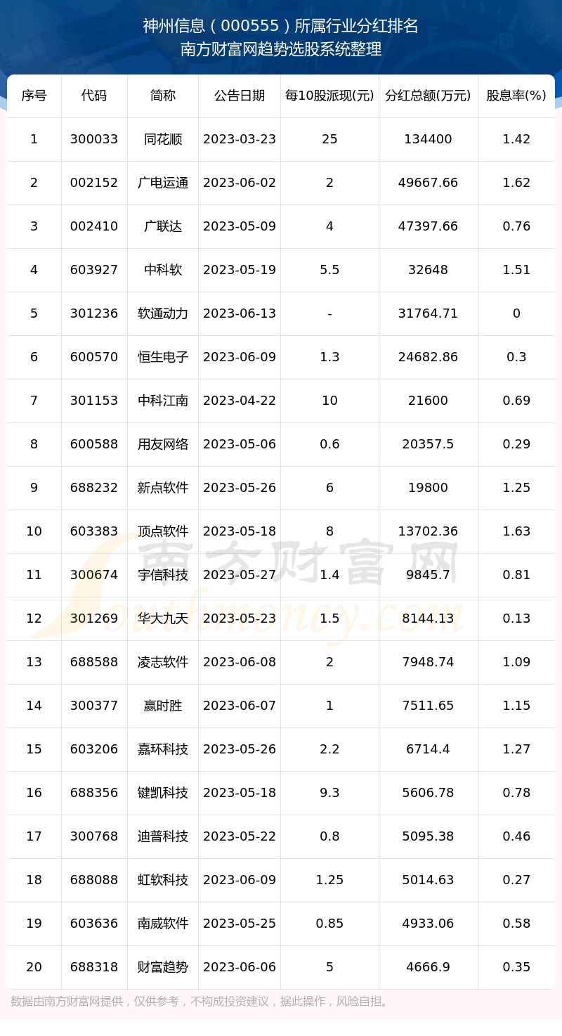按照趋势选股系统统计,神州信息所属行业为系统集成行业,系统集成行业分红排名情况如下表: