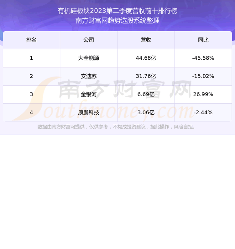 按照趋势选股系统统计,该股所属板块为有机硅板块,该板块共有4只股票,美思德2023第二季度营收在该板块中排名为第4名,该板块2023第二季度营收排名前十的股票如下表: