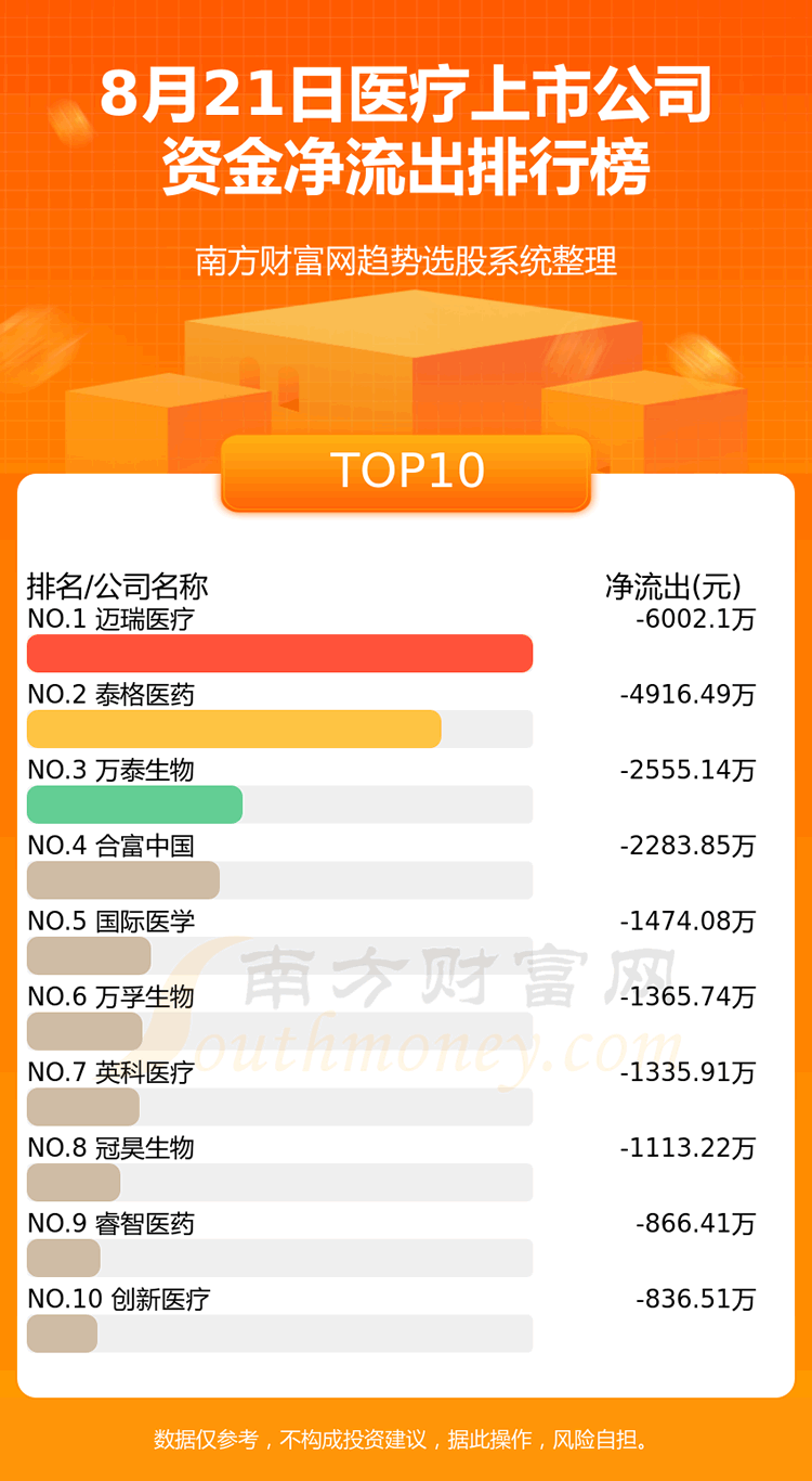 医疗上市公司8月21日资金净流出情况来看,迈瑞医疗位列第一位,主力净流出达到-6002.1万元;泰格医药排名第二,主力净流出为-4916.49万元;万泰生物排名第三,主力净流出-2555.14万元。主力净流出排名前10的还有:合富中国、国际医学、万孚生物、英科医疗、冠昊生物、睿智医药、创新医疗。