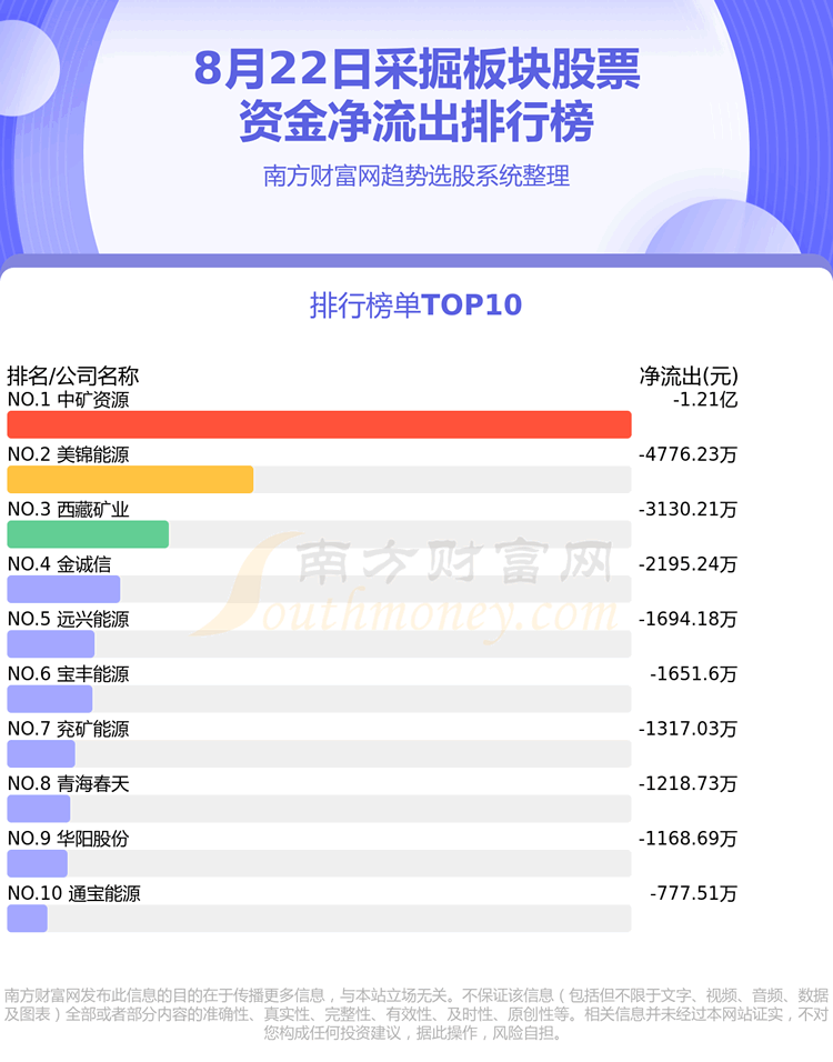 采掘板块股票8月22日资金净流出情况来看,中矿资源位列第一位,主力净流出达到-1.21亿元;美锦能源排名第二,主力净流出为-4776.23万元;西藏矿业排名第三,主力净流出-3130.21万元。主力净流出排名前10的还有:金诚信、远兴能源、宝丰能源、兖矿能源、青海春天、华阳股份、通宝能源。