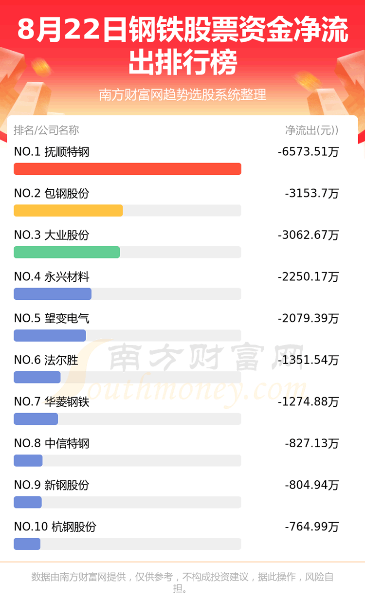钢铁股票8月22日资金净流出情况来看,抚顺特钢位列第一位,主力净流出达到-6573.51万元;包钢股份排名第二,主力净流出为-3153.7万元;大业股份排名第三,主力净流出-3062.67万元。主力净流出排名前10的还有:永兴材料、望变电气、法尔胜、华菱钢铁、中信特钢、新钢股份、杭钢股份。