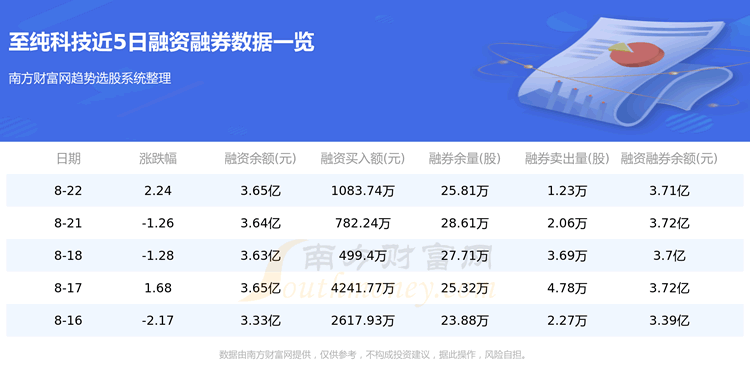 8月22日至纯科技融券信息显示,融资方面,当日融资买入1083.74万元,融资偿还1058万元,融资净买额25.74万元。融券方面,融券卖出1.23万股,融券偿还4.03万股,融券余量25.81万股,融券余额683.58万元。融资融券余额3.71亿元。
