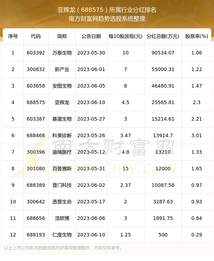 按照趋势选股系统统计,亚辉龙所属行业为试剂行业,试剂行业分红排名情况如下表: