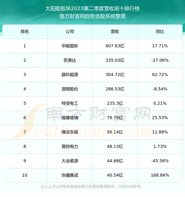 按照趋势选股系统统计,该股所属板块为太阳能板块,该板块共有70只股票,江苏新能2023第二季度营收在该板块中排名为第70名,该板块2023第二季度营收排名前十的股票如下表: