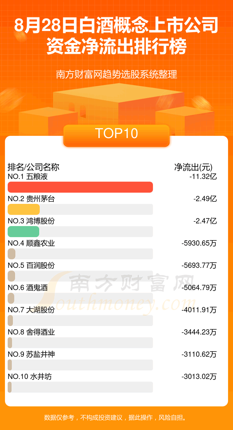 白酒概念上市公司8月28日资金净流出情况来看,五粮液位列第一位,主力净流出达到-11.32亿元;贵州茅台排名第二,主力净流出为-2.49亿元;鸿博股份排名第三,主力净流出-2.47亿元。主力净流出排名前10的还有:顺鑫农业、百润股份、酒鬼酒、大湖股份、舍得酒业、苏盐井神、水井坊。
