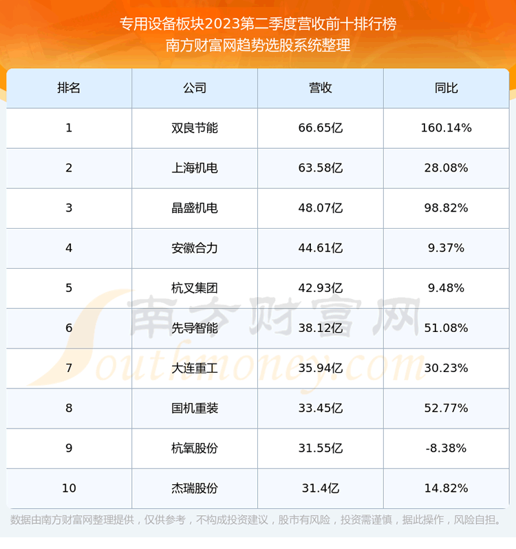 按照趋势选股系统统计,该股所属板块为专用设备板块,该板块共有201只股票,南方路机2023第二季度营收在该板块中排名为第201名,该板块2023第二季度营收排名前十的股票如下表: