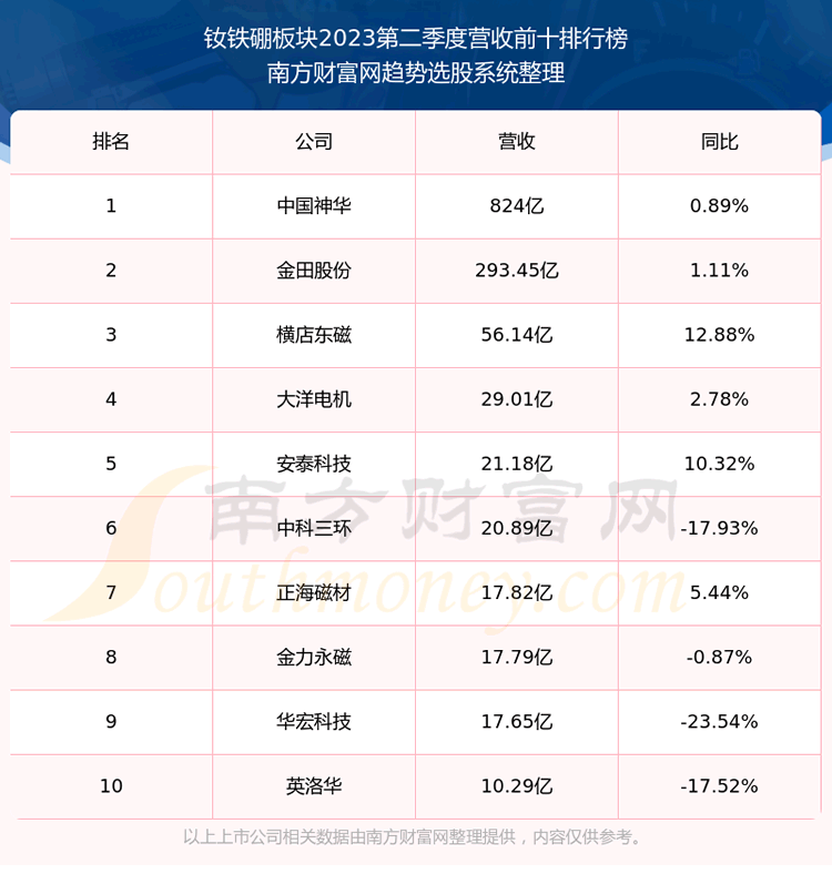 按照趋势选股系统统计,该股所属板块为钕铁硼板块,该板块共有16只股票,宁波韵升2023第二季度营收在该板块中排名为第16名,该板块2023第二季度营收排名前十的股票如下表:
