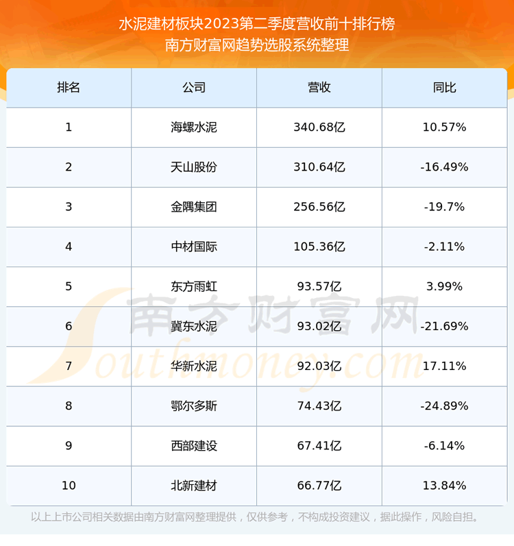 按照趋势选股系统统计,该股所属板块为水泥建材板块,该板块共有51只股票,福建水泥2023第二季度营收在该板块中排名为第33名,该板块2023第二季度营收排名前十的股票如下表: