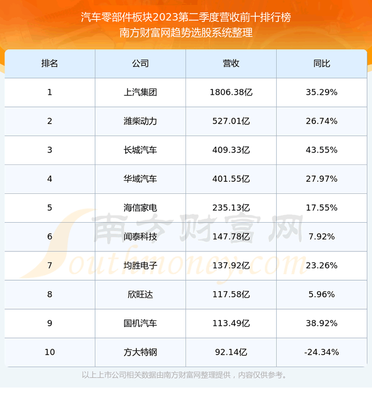 按照趋势选股系统统计,该股所属板块为汽车零部件板块,该板块共有397只股票,联明股份2023第二季度营收在该板块中排名为第291名,该板块2023第二季度营收排名前十的股票如下表: