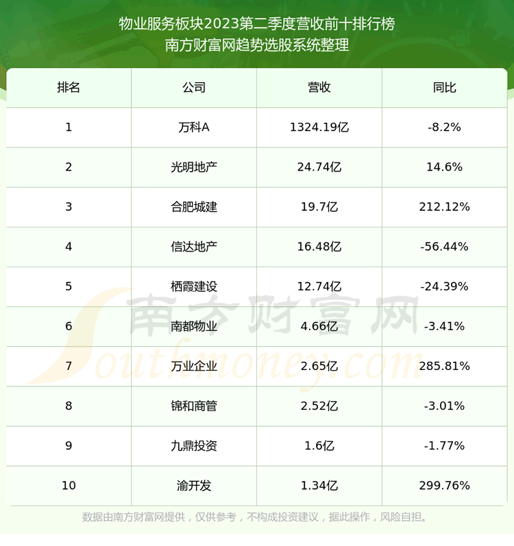 按照趋势选股系统统计,该股所属板块为物业服务板块,该板块共有11只股票,锦和商管2023第二季度营收在该板块中排名为第8名,该板块2023第二季度营收排名前十的股票如下表: