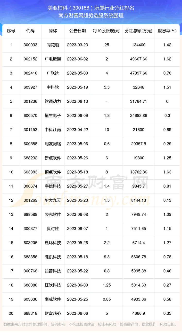 按照趋势选股系统统计,美亚柏科所属行业为软件开发行业,软件开发行业分红排名情况如下表:
