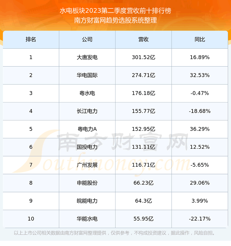 按照趋势选股系统统计,该股所属板块为水电板块,该板块共有37只股票,长江电力2023第二季度营收在该板块中排名为第4名,该板块2023第二季度营收排名前十的股票如下表: