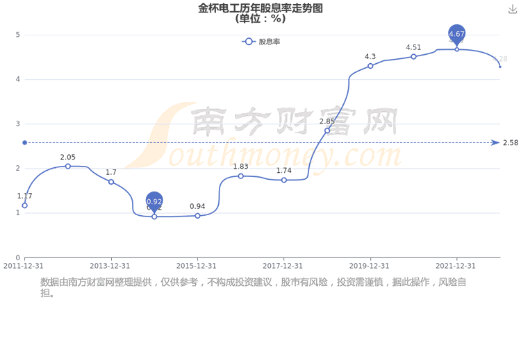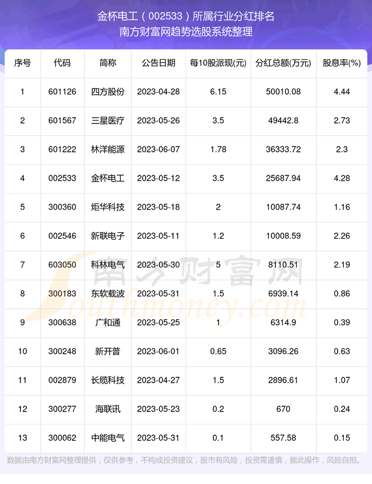 按照趋势选股系统统计,金杯电工所属行业为电线电缆行业,电线电缆行业分红排名情况如下表: