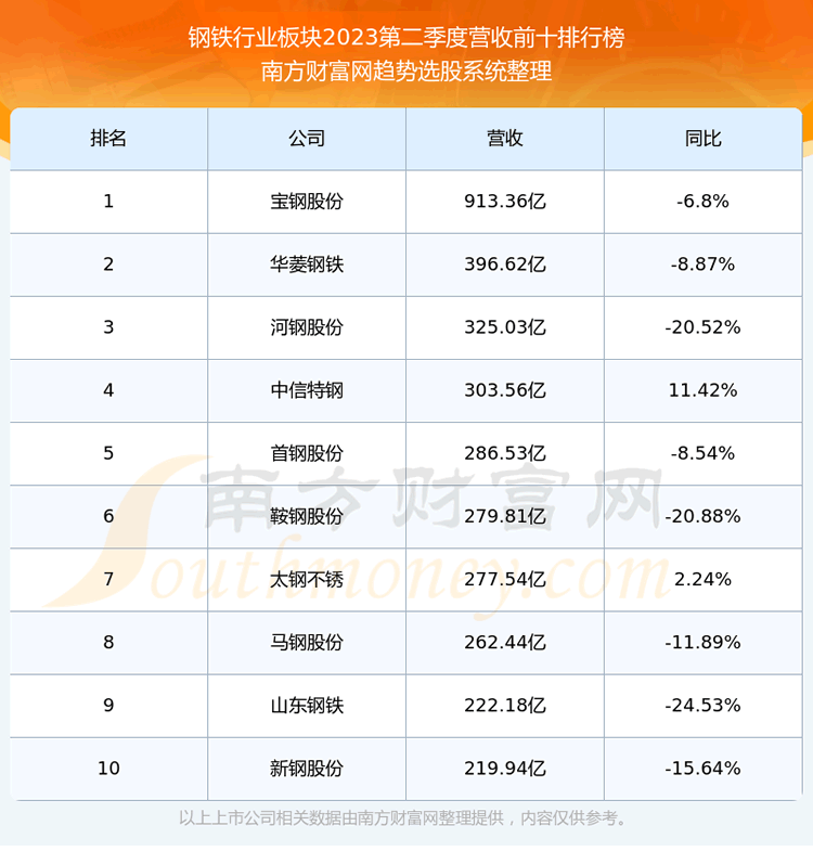 按照趋势选股系统统计,该股所属板块为钢铁行业板块,该板块共有39只股票,山东钢铁2023第二季度营收在该板块中排名为第9名,该板块2023第二季度营收排名前十的股票如下表: