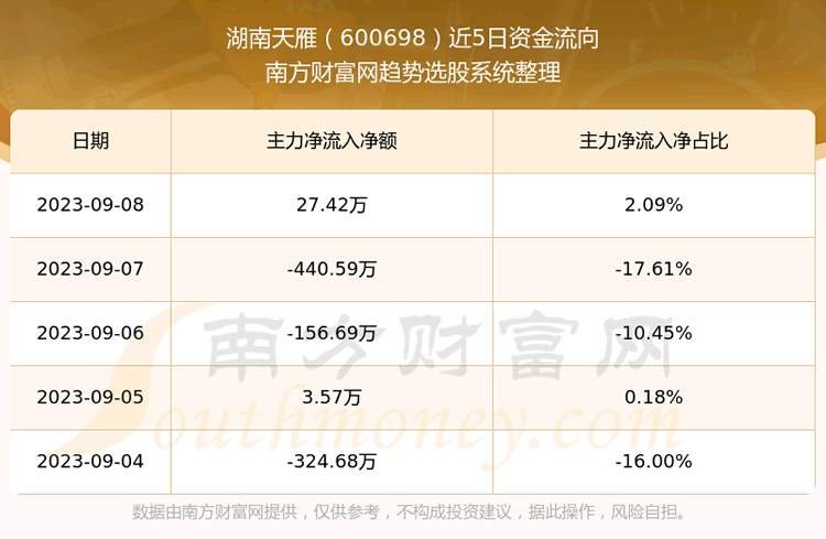 二、湖南天雁(600698)近期盘面、资金面情况