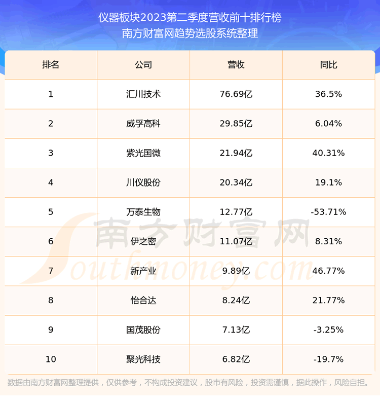 按照趋势选股系统统计,该股所属板块为仪器板块,该板块共有24只股票,圣湘生物2023第二季度营收在该板块中排名为第24名,该板块2023第二季度营收排名前十的股票如下表: