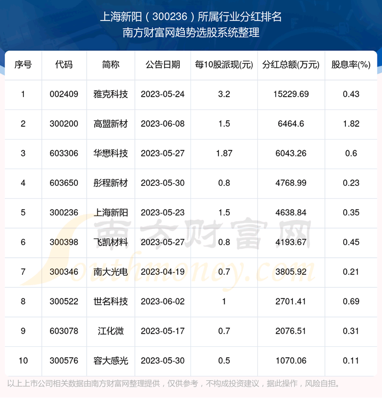 二、上海新阳300236行业分红排名