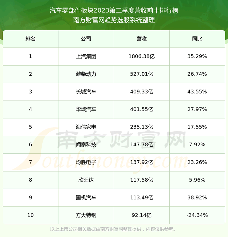 按照趋势选股系统统计,该股所属板块为汽车零部件板块,该板块共有397只股票,豪能股份2023第二季度营收在该板块中排名为第217名,该板块2023第二季度营收排名前十的股票如下表: