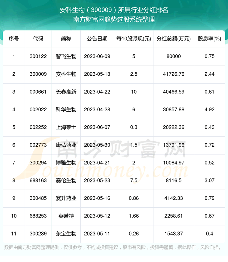 按照趋势选股系统统计,安科生物所属行业为生物制品行业,生物制品行业分红排名情况如下表: