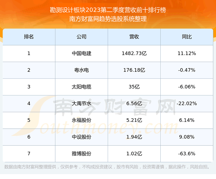 按照趋势选股系统统计,该股所属板块为勘测设计板块,该板块共有7只股票,中国能建2023第二季度营收在该板块中排名为第7名,该板块2023第二季度营收排名前十的股票如下表:
