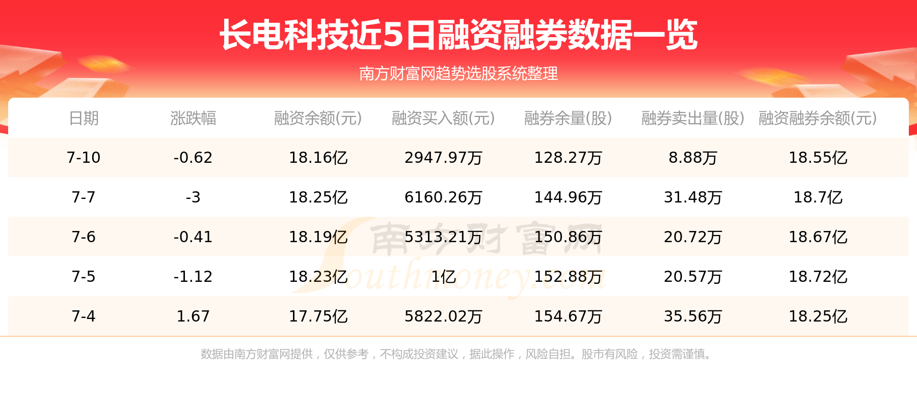 7月10日长电科技融券信息显示,融资方面,当日融资买入2947.97万元,融资偿还3917.82万元,融资净买额-969.85万元。融券方面,融券卖出8.88万股,融券偿还25.57万股,融券余量128.27万股,融券余额3919.88万元。融资融券余额18.55亿元。近5日融资融券数据一览见下表: