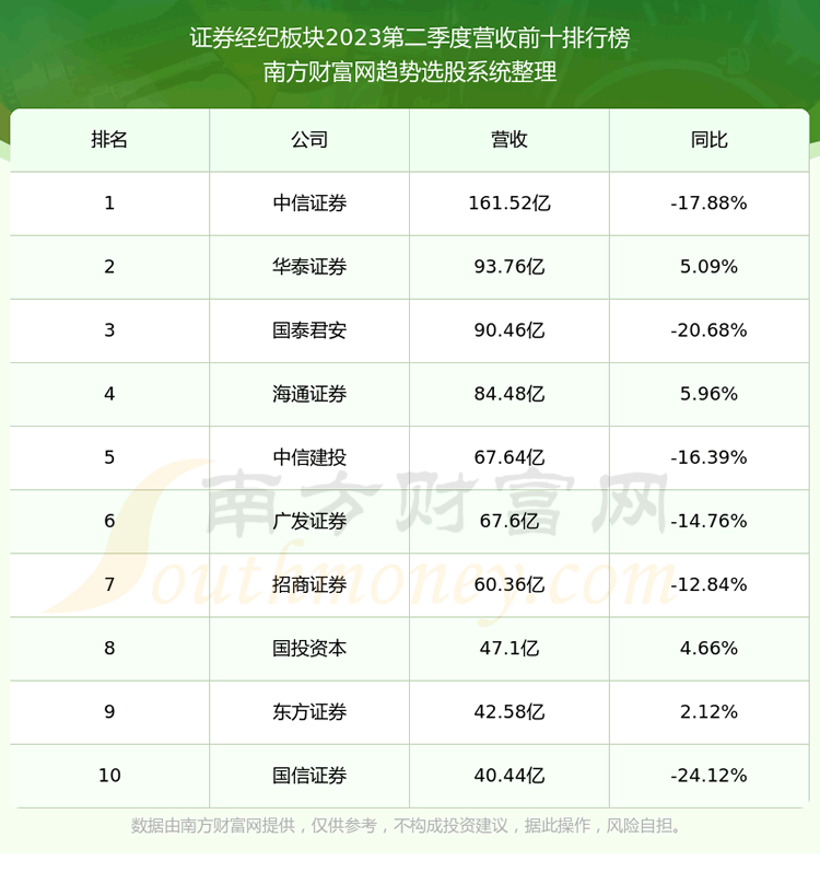 按照趋势选股系统统计,该股所属板块为证券经纪板块,该板块共有36只股票,财达证券2023第二季度营收在该板块中排名为第31名,该板块2023第二季度营收排名前十的股票如下表: