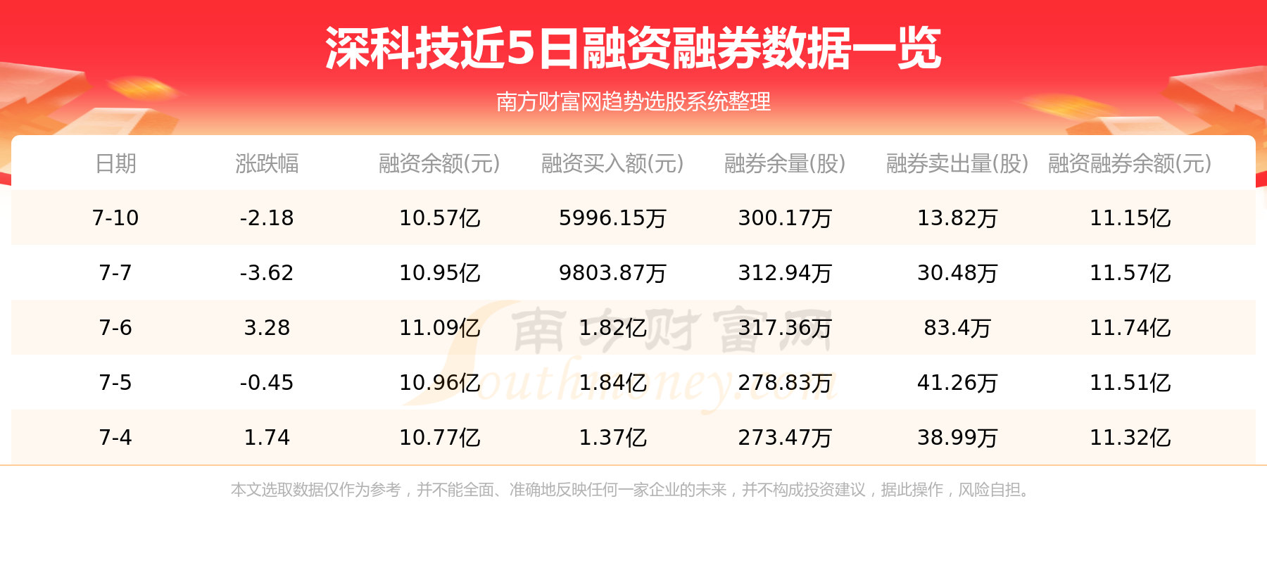 7月10日深科技融券信息显示,融资方面,当日融资买入5996.15万元,融资偿还9775.31万元,融资净买额-3779.16万元。融券方面,融券卖出13.82万股,融券偿还26.59万股,融券余量300.17万股,融券余额5787.22万元。融资融券余额11.15亿元。近5日融资融券数据一览见下表: