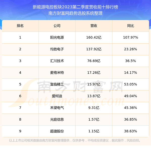 按照趋势选股系统统计,该股所属板块为新能源电控板块,该板块共有9只股票,禾望电气2023第二季度营收在该板块中排名为第7名,该板块2023第二季度营收排名前十的股票如下表: