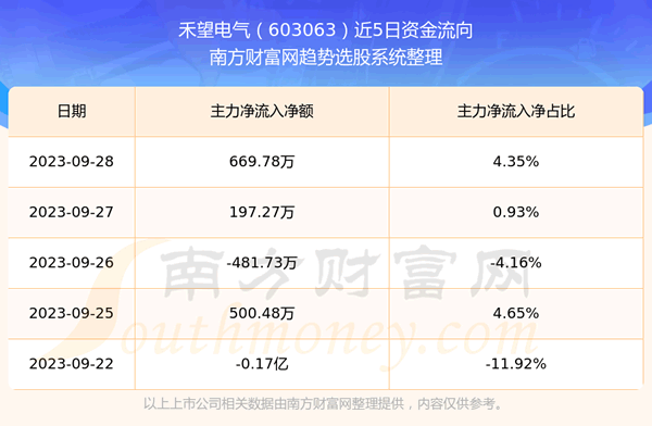 二、禾望电气(603063)近期盘面、资金面情况