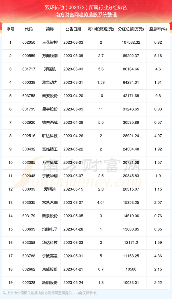 二、双环传动002472行业分红排名