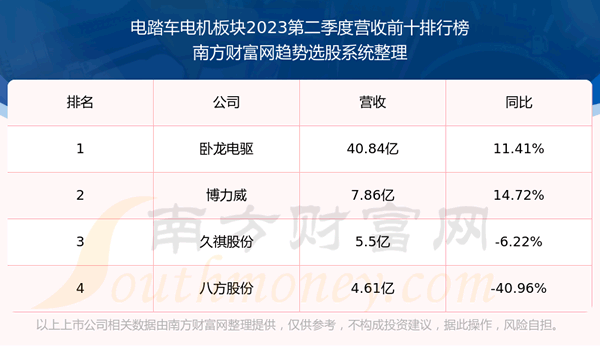 按照趋势选股系统统计,该股所属板块为电踏车电机板块,该板块共有4只股票,八方股份2023第二季度营收在该板块中排名为第4名,该板块2023第二季度营收排名前十的股票如下表: